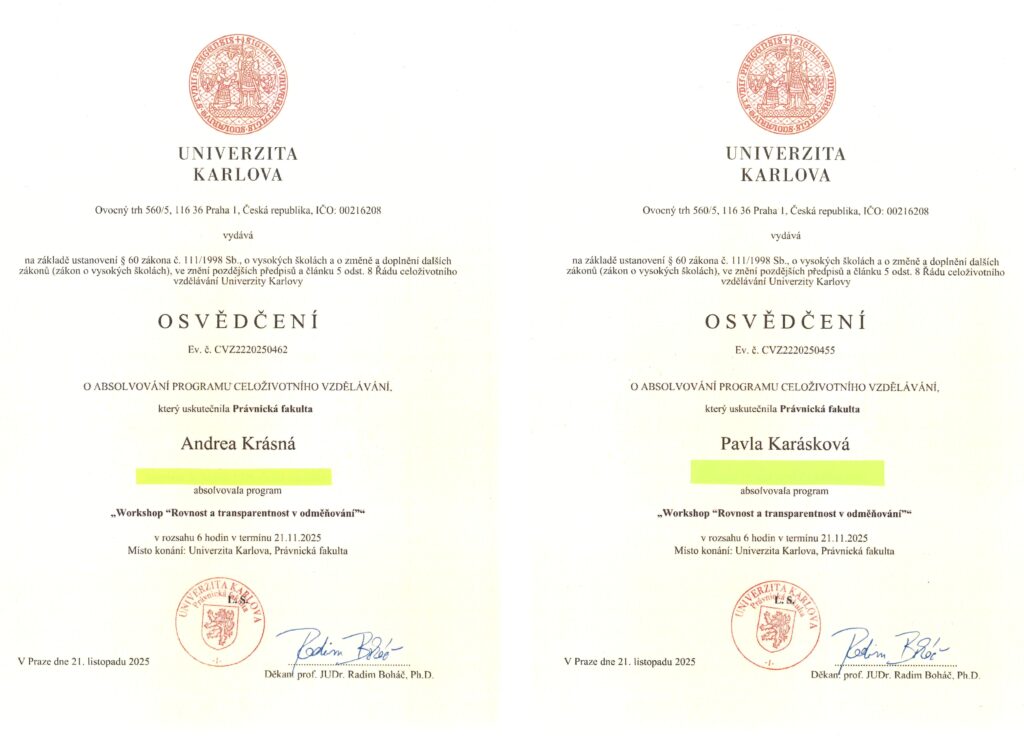 Na téma “Rovnost a transparentnost v odměňování” jsme se s kolegyní Pavlou Karáskovou účastnily workshopu, kterým nás provedl tým z Právnické fakulty Univerzity Karlovy, složený z prof. Kristiny Koldinské, doc. Jakuba Tomšeje a dr. Lucie Přenosilové.